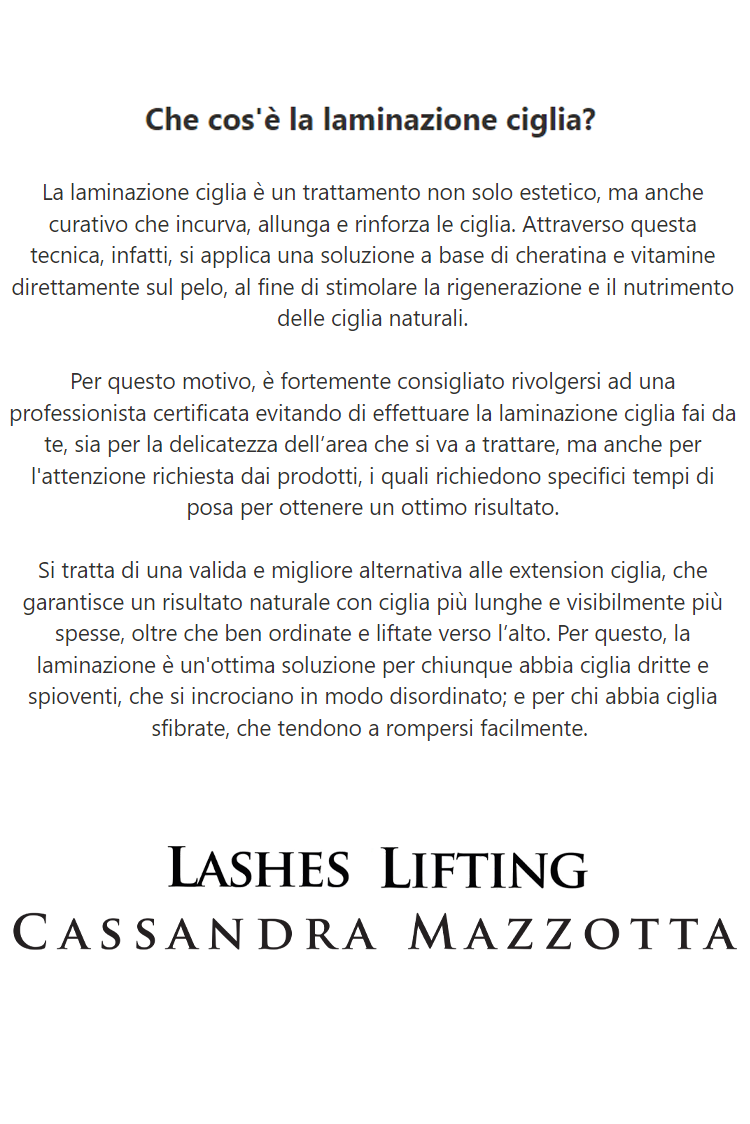 R: La laminazione ciglia non presenta delle controindicazioni e non crea alcun tipo di problema, ma come suggerito in precedenza, è necessario affidarsi a un personale qualificato che utilizzi prodotti professionali e preferibilmente certificati, il quale saprà esattamente come comportarsi di fronte al singolo cliente. Sconsiglio, inoltre, il trattamento a chi soffre di malattie degli occhi o durante la gravidanza e l'allattamento.